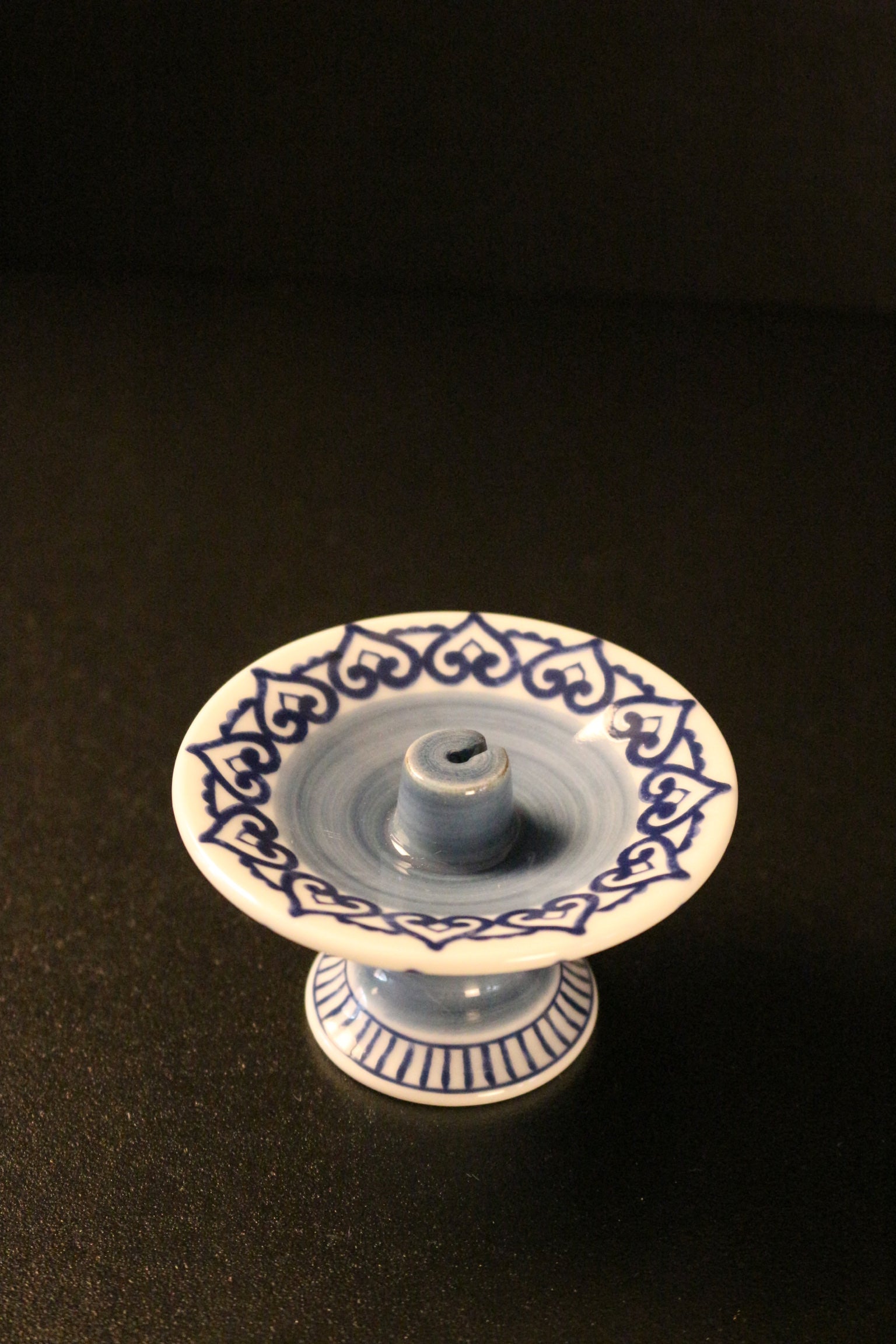 Light the tip of the incense stick and gently extinguish the flame, then insert the incense stick into the holder. Place the cone and coil incense on the central part.