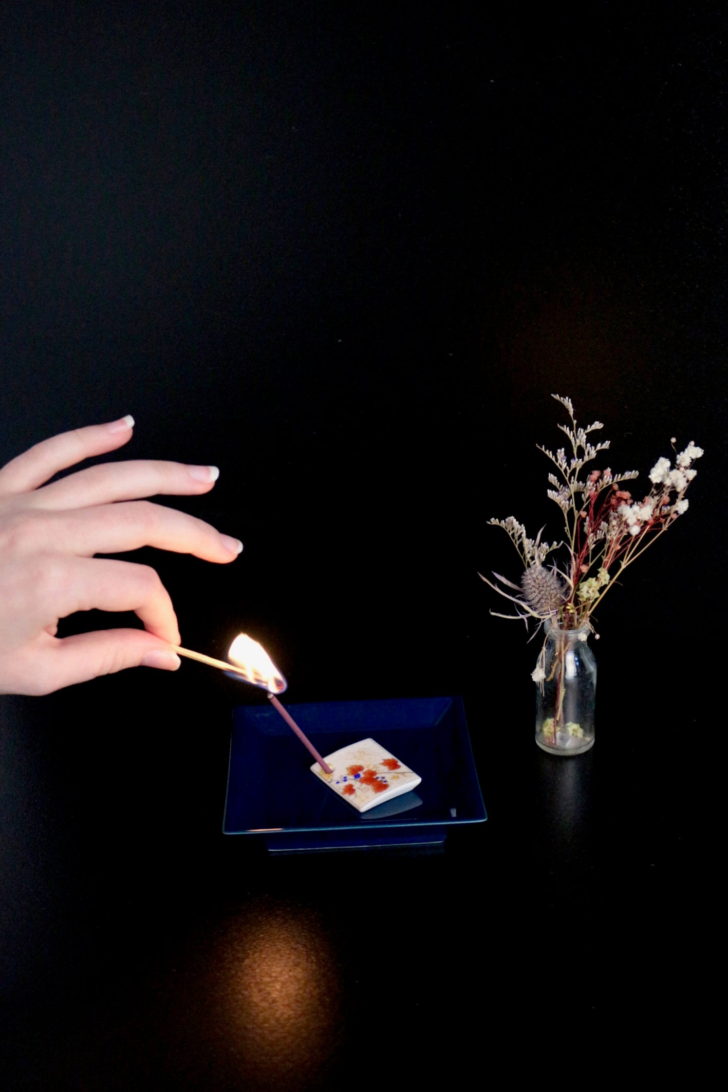 À utiliser avec un bâton d'encens. Allumez la pointe du bâtonnet d'encens et éteignez doucement la flamme, puis insérez l'encens dans le support. Placez le support sur un plateau en matériau résistant à la chaleur pour recueillir les cendres.