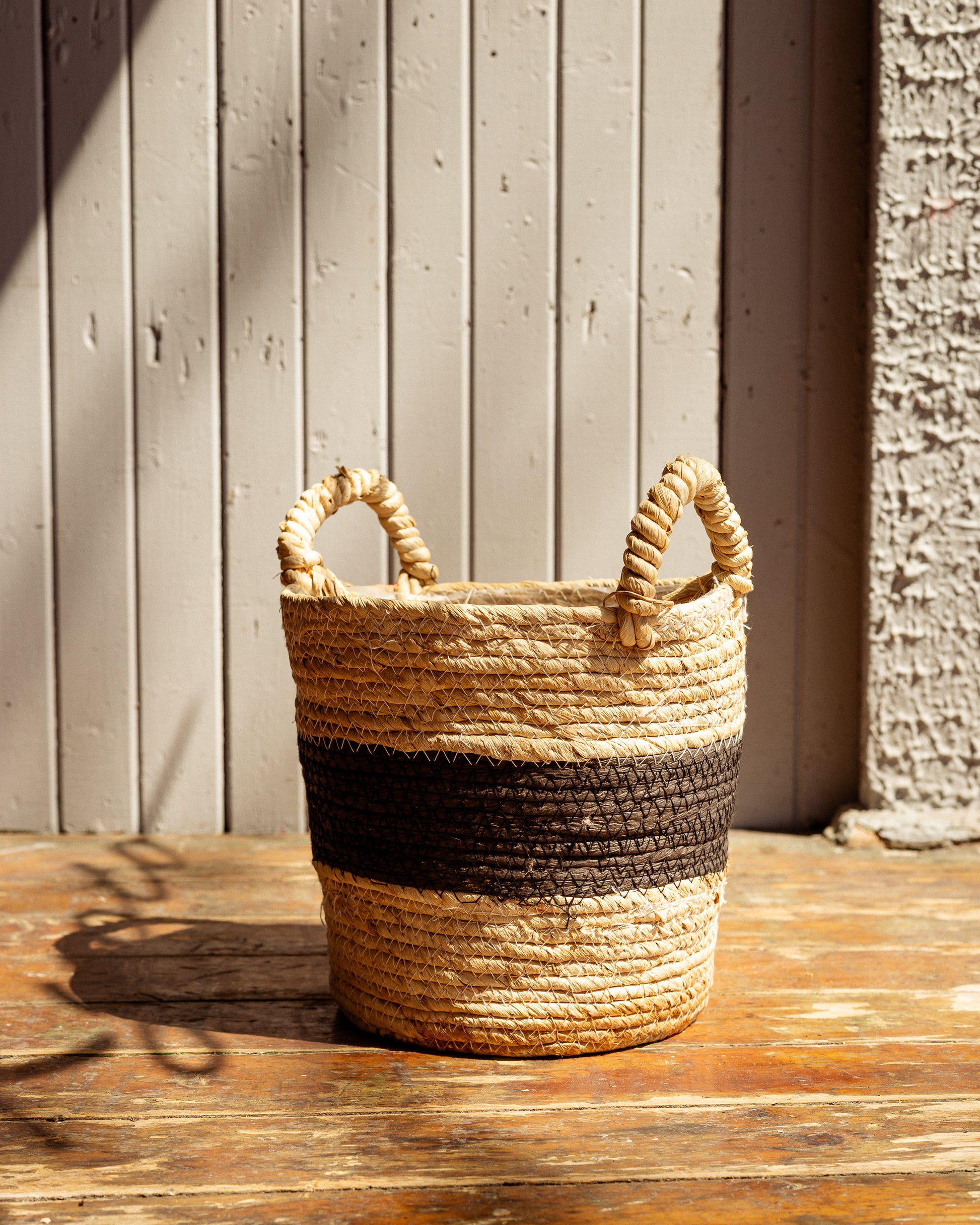 Panier en jonc de mer naturel et noir, pour utiliser comme cache-pot pour une plante ou comme panier pour du rangement.